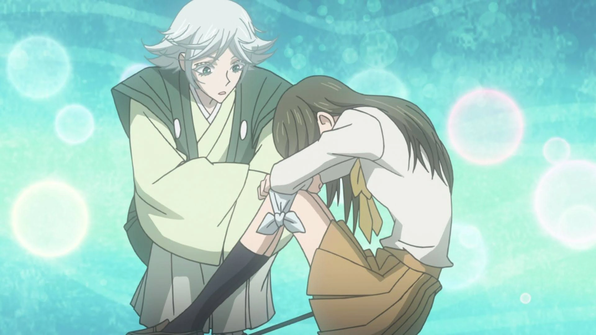 Nanami does her homework after school, and Tomoe accidentally falls asleep. She absentmindedly leaves without Tomoe to turn in her homework. While she walks across the schoolyard, the white snake, now in human form, takes her away to the Yonomori shrine where he is a familiar.
