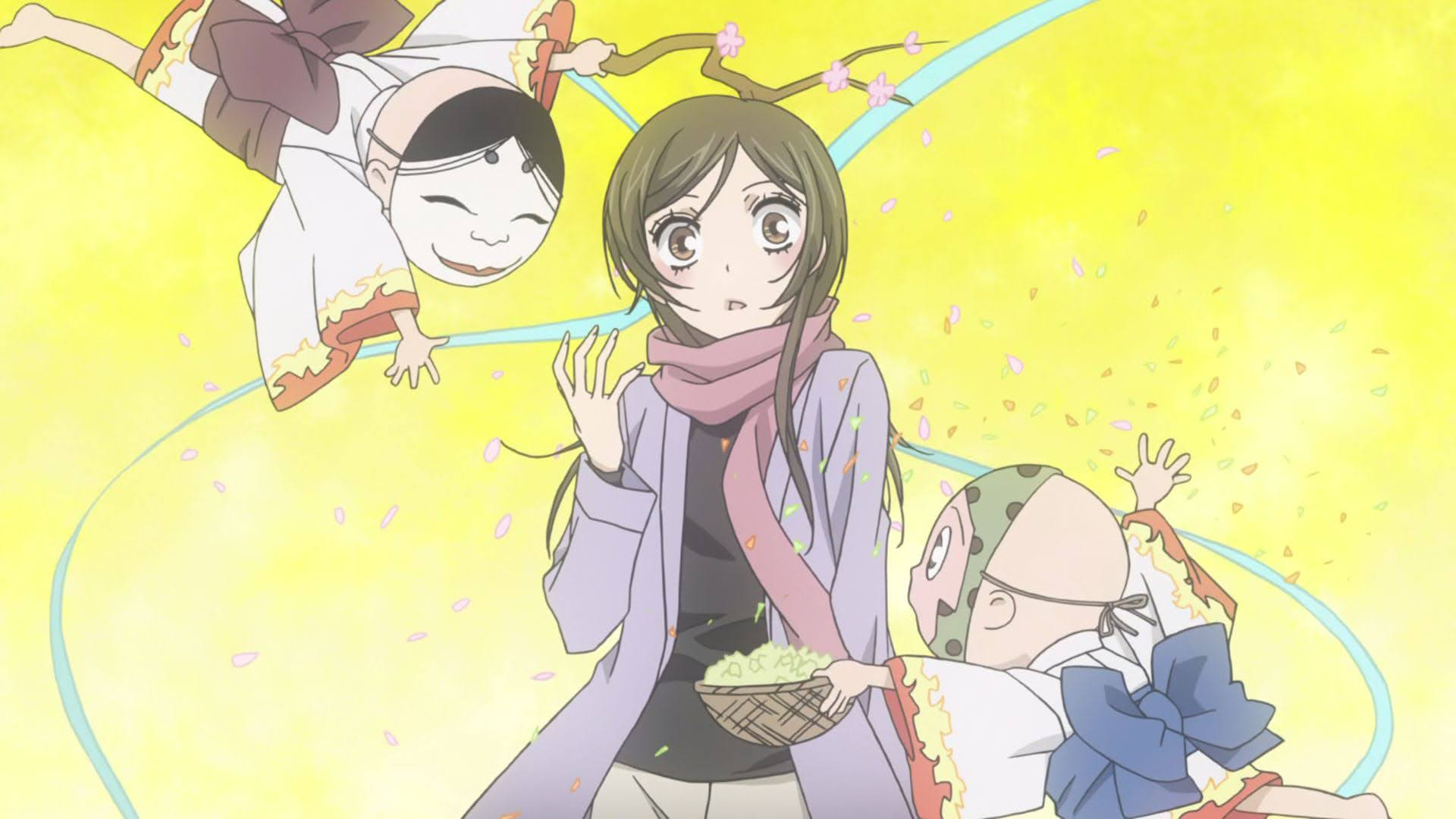 As a sign of gratitude, Mikage then gives her a kiss on the forehead and tells her that she's now the new Land God. He entrusted her to his house, a rundown shrine inhabited by a hostile fox-eared yokai, Tomoe, and two other small spirits, the shikigamis.